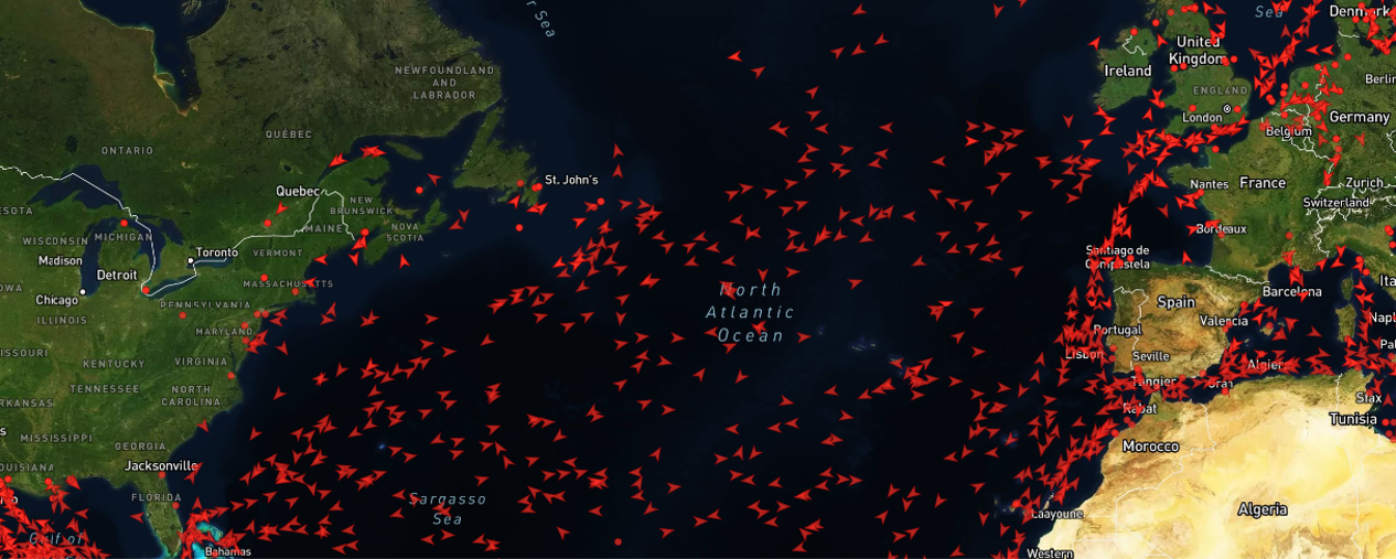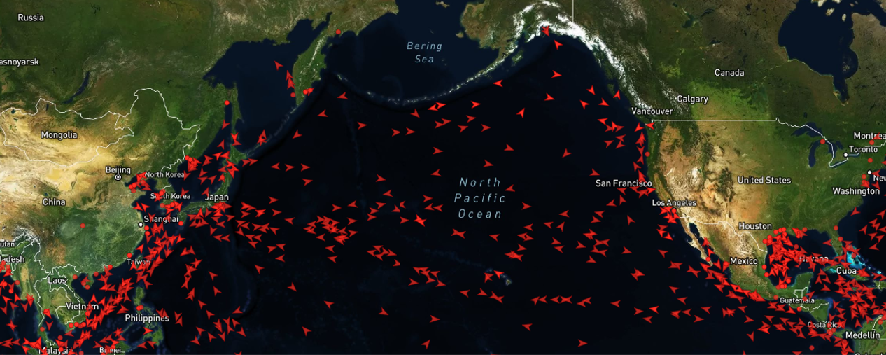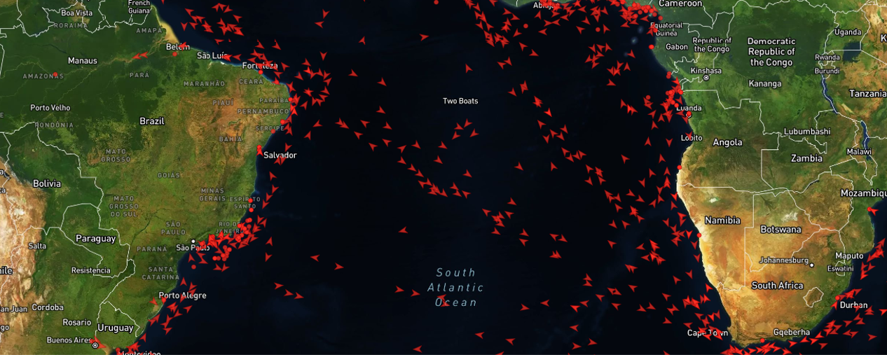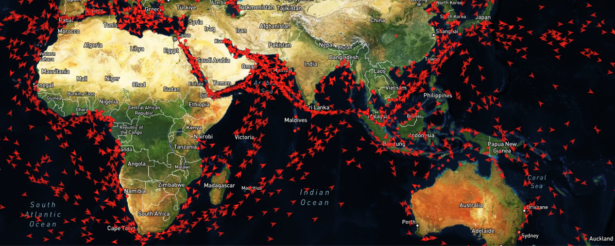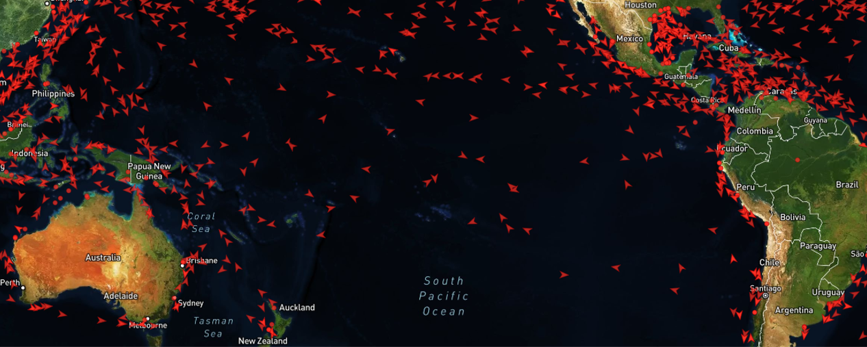 Real-time visualization of global maritime activity and vessel distribution.